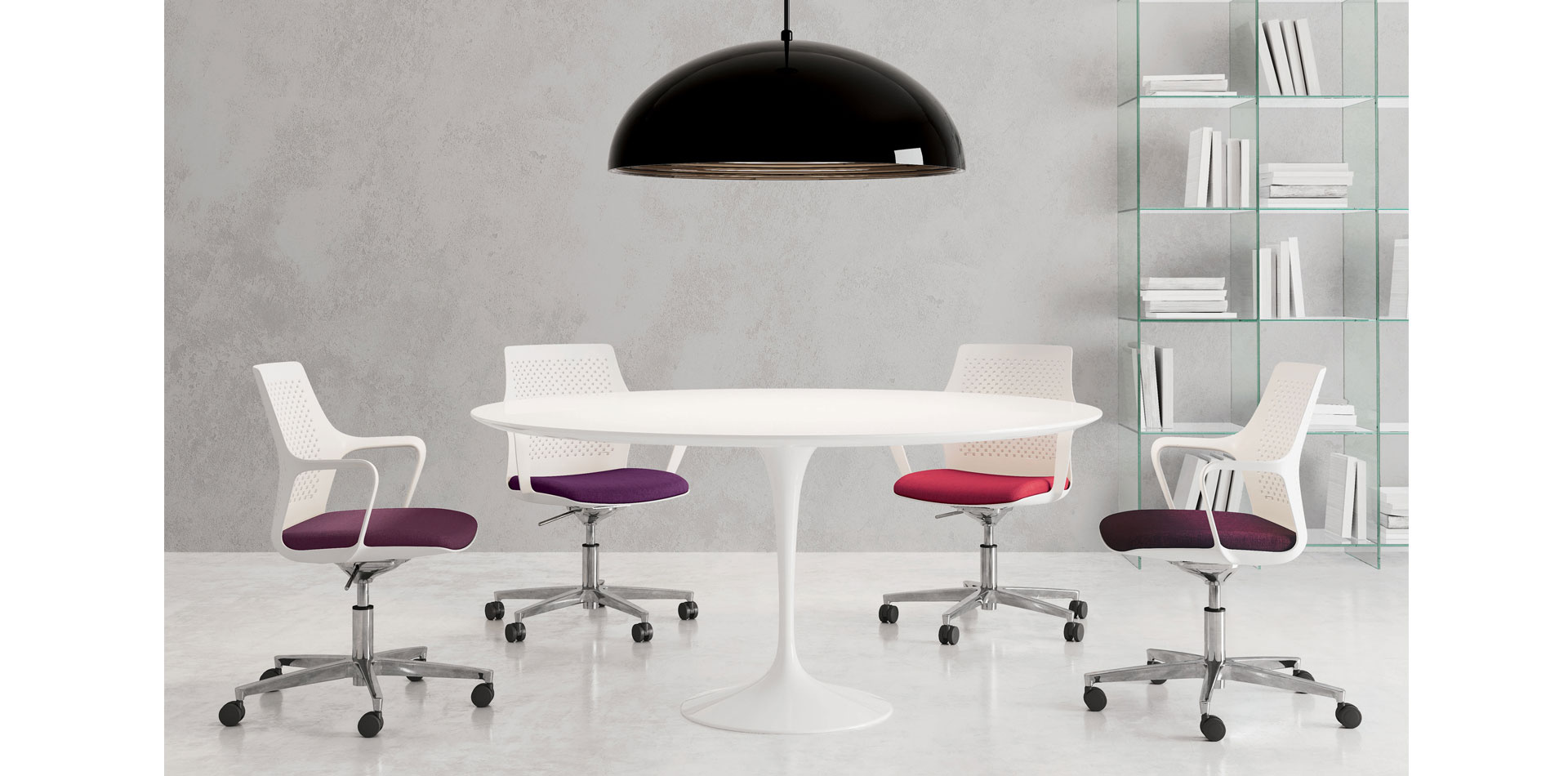 La morbidezza della monoscocca si sposa perfettamente con i quattro tipi di basi, ampliando l’impiego della seduta. Il cuscino è l’elemento che introduce il colore, variando ad ogni abbinamento lo stile della sedia e dell’ambiente circostante.